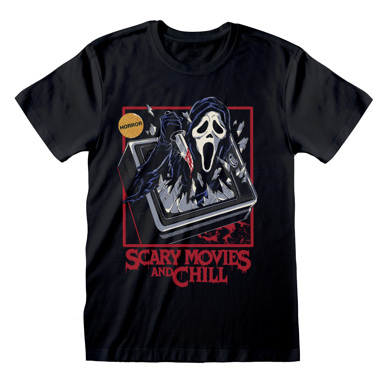 Impresa sobre una base de algodón negro de primera calidad mediante serigrafía de alta calidad, la ilustración muestra a Cara de Fantasma irrumpiendo a través de una pantalla de TV agrietada, con colores vibrantes y detalles llamativos. Acabada con la divertida leyenda "Scary Movies and Chill", es la camiseta definitiva para noches de cine, convenciones, eventos de Halloween o para llevar a diario con actitud.